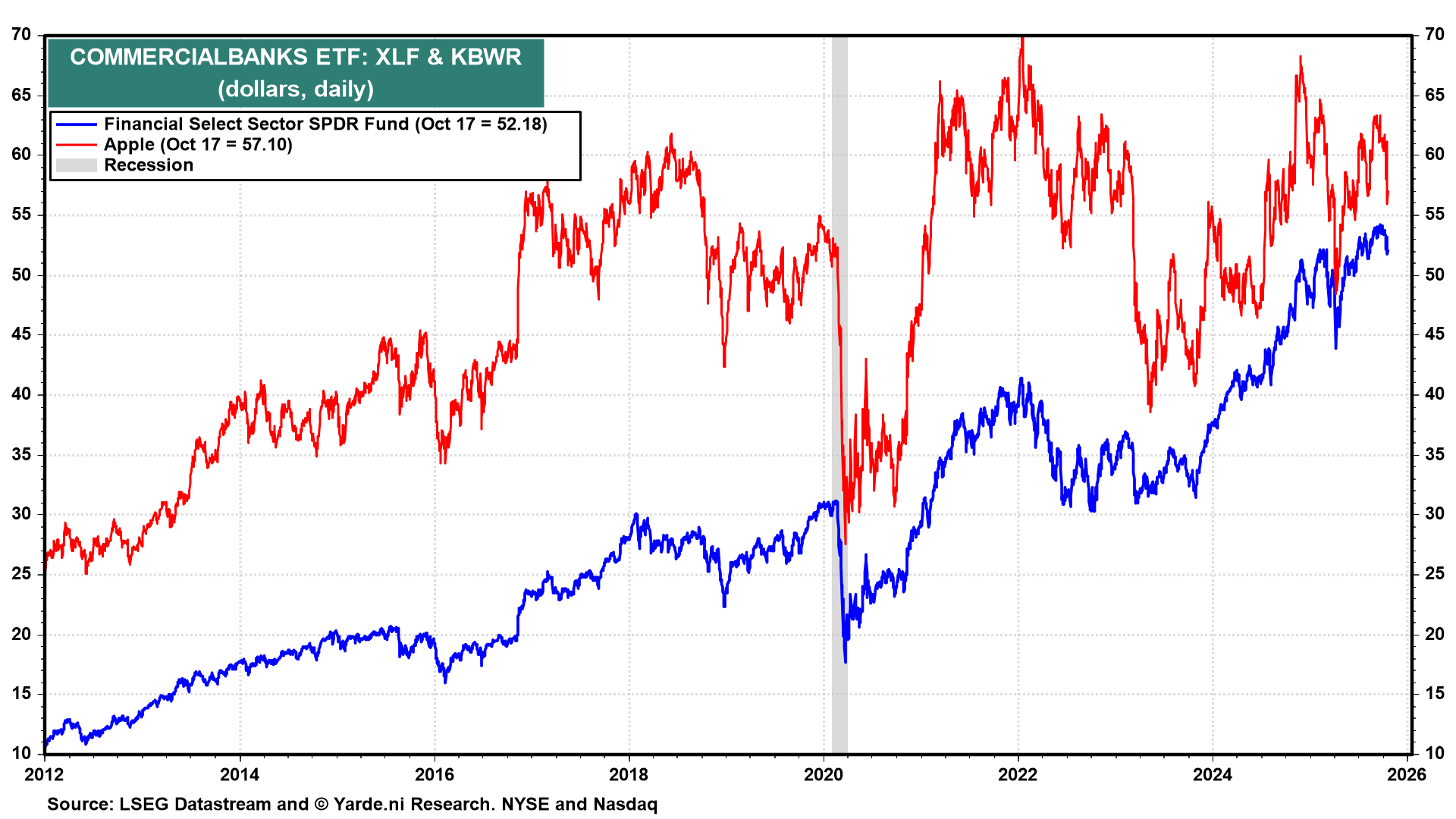 Much will depend on investors’ assessments of the credit markets. They were spooked last week (just ahead of Halloween) by news that Zions Bancorp incurred a $50 million charge-off in Q3 due to legal actions against two borrowers. Stock prices dropped sharply on Thursday, led by the KBW Regional Banking ETF (chart).