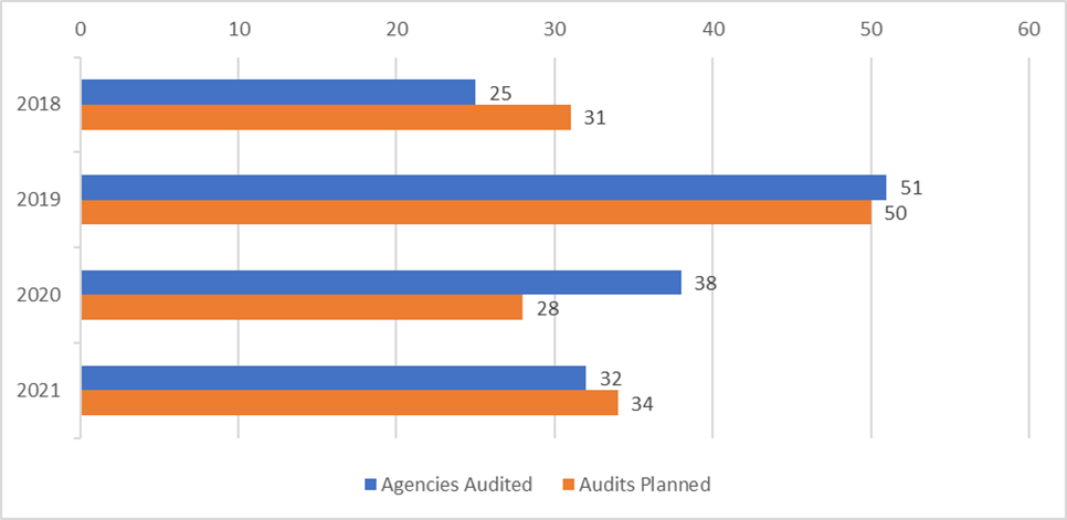 The auditors’ analyses found that for the 2018–2021 cycle, the audit plans covered 143 agencies, which included most of the agencies listed under its jurisdiction, except for three agencies.[6] In their response, EEPC’s officials stated that the three agencies were added to the audit plan after the original audit plan was created. Instead of providing the updated audit plans to the team, they provided the original audit plans; however, auditors reviewed audit documentations which verified that the agencies were still audited during the 2018–2021 cycle.