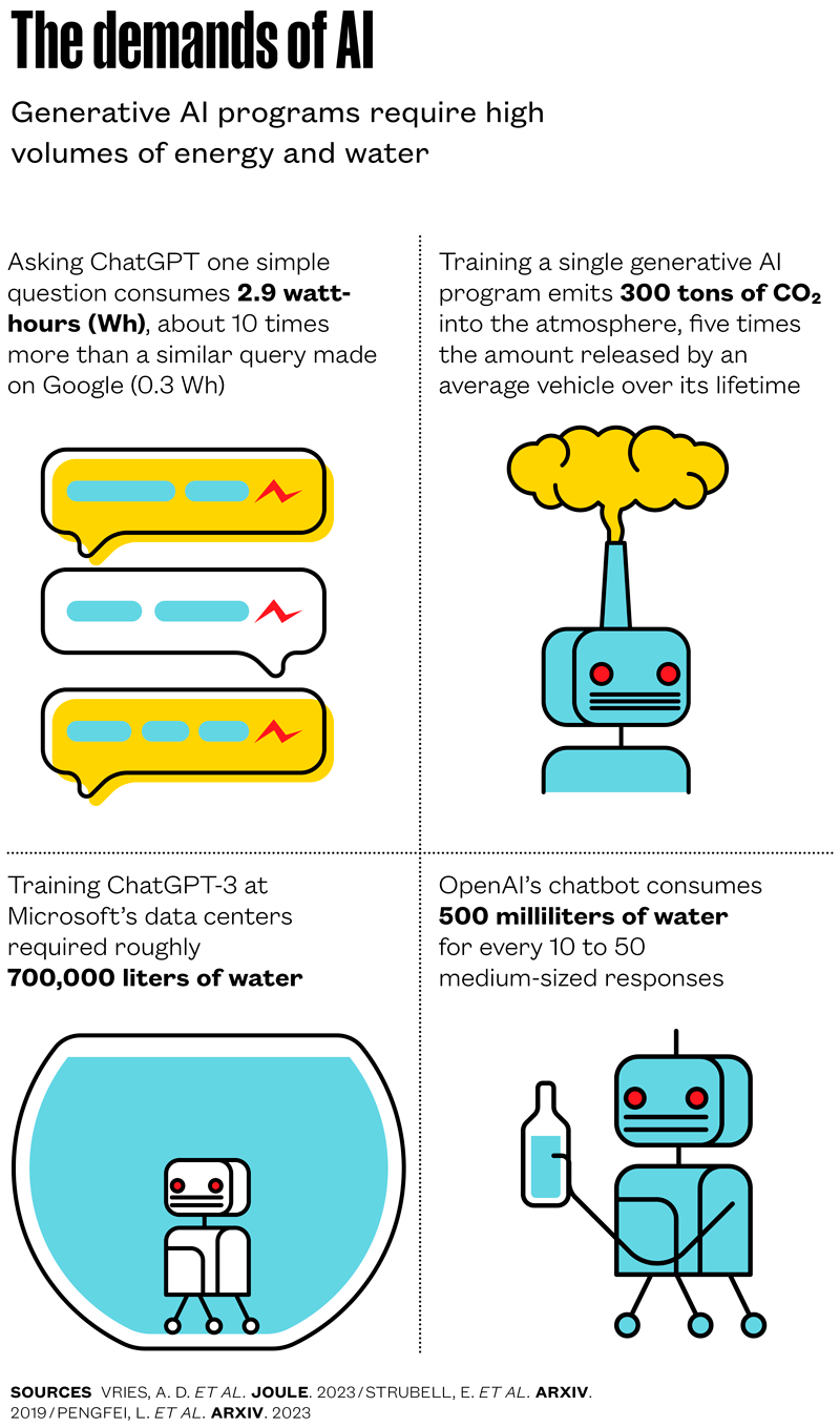 A study published in Joule by Dutch researchers in October 2023 showed that asking ChatGPT one simple question consumes 3 watt-hours (Wh), almost 10 times more energy than a similar search made on Google. This may seem like a small number, but it is significant when considering that the chatbot has more than 400 million active users per week, making more than one billion queries per day.