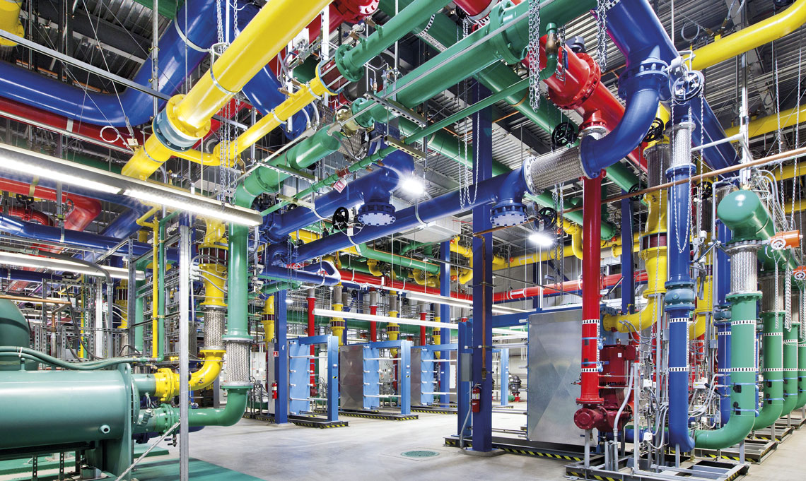 GoogleCooling system at a Google data center: the blue pipes supply cold water and the red pipes return heated liquid to be cooledGoogle