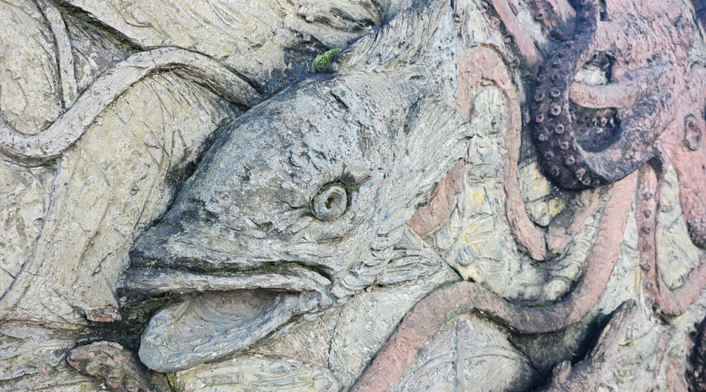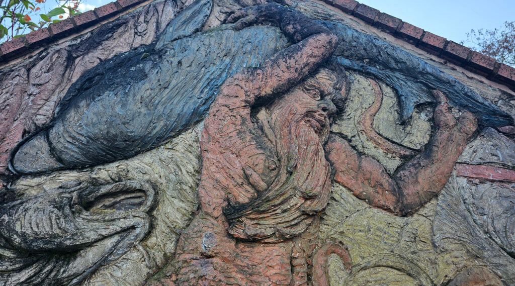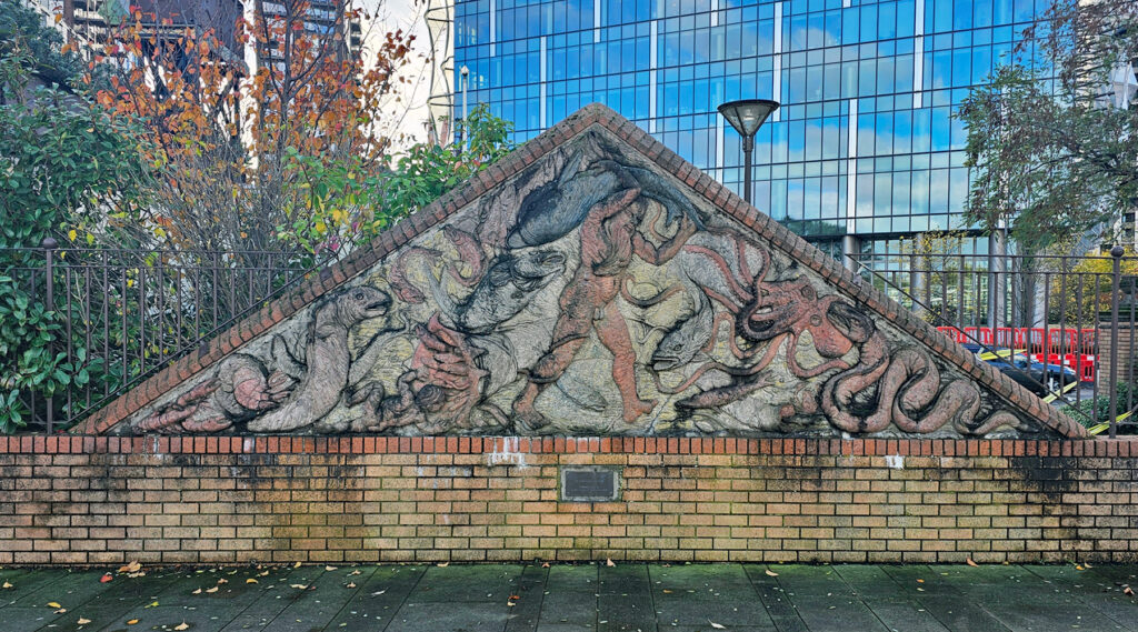 It’s a slightly odd bas-relief mural, as it looks almost as if it were moved here from somewhere else. The triangular design just doesn’t seem quite right. Yet, when realising it was made in 1988, it suddenly seems perfect, as the colours and design are strongly reminiscent of artworks from the Docklands area.