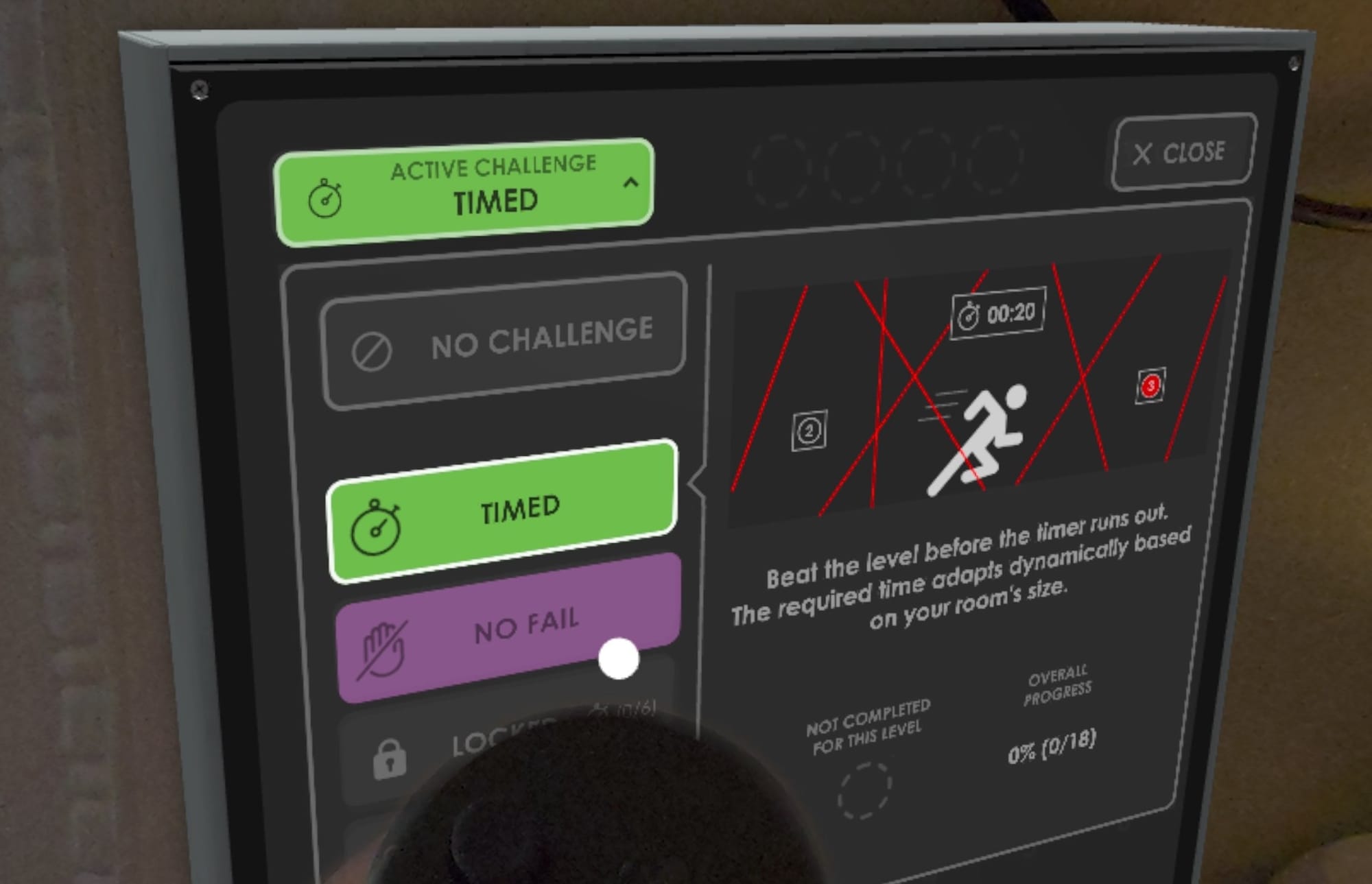 Gameplay consists of getting from one end of your room to the other. The only rule is that your head, arms and spine cannot cross paths with one of the lasers. The game uses Quest’s upper body tracking to figure out where you are and you can learn through progression alone that your legs aren’t tracked. That means your legs can’t collide with the lasers, nor end your run across the room. It’s up to you whether you let that affect your strategies around the lasers or not. You can use it like people who cheat in laser tag by covering their body-worn sensors, or you can just continue to carefully step over lasers near the ground because it’s fun to imagine the system could track that danger too.