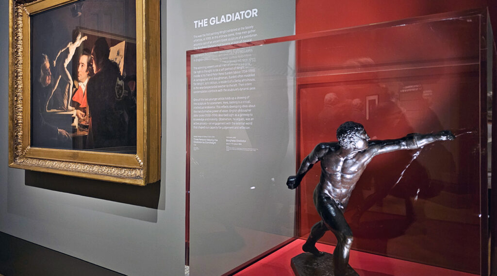 To complement the air pump painting, they have an actual air pump on display, and have also included an orrery of the sort included in another of his works. His rather grindr-style painting of three men inspecting a statue of a very fit gladiator is also accompanied by the sculpture.