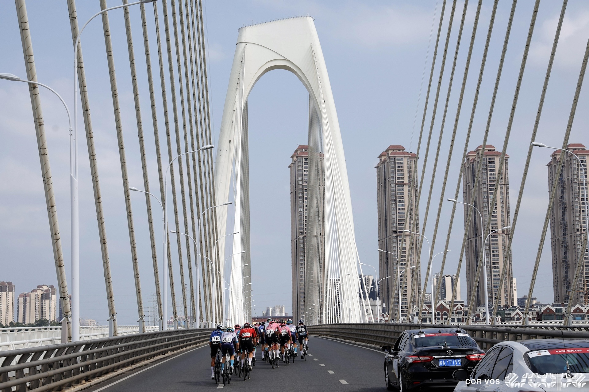 Bike races contain all of the above but at Guangxi the latter side is pulled more into focus. It’s at the gritty end of the spectrum. Team buses are nowhere to be found and instead of hiding behind tinted windows the riders crouch on stools beneath branded marquees pulling on jerseys and attaching race radios, while dead-eyed soigneurs slather the skinny boys in suncream and locals look on in bemusement.