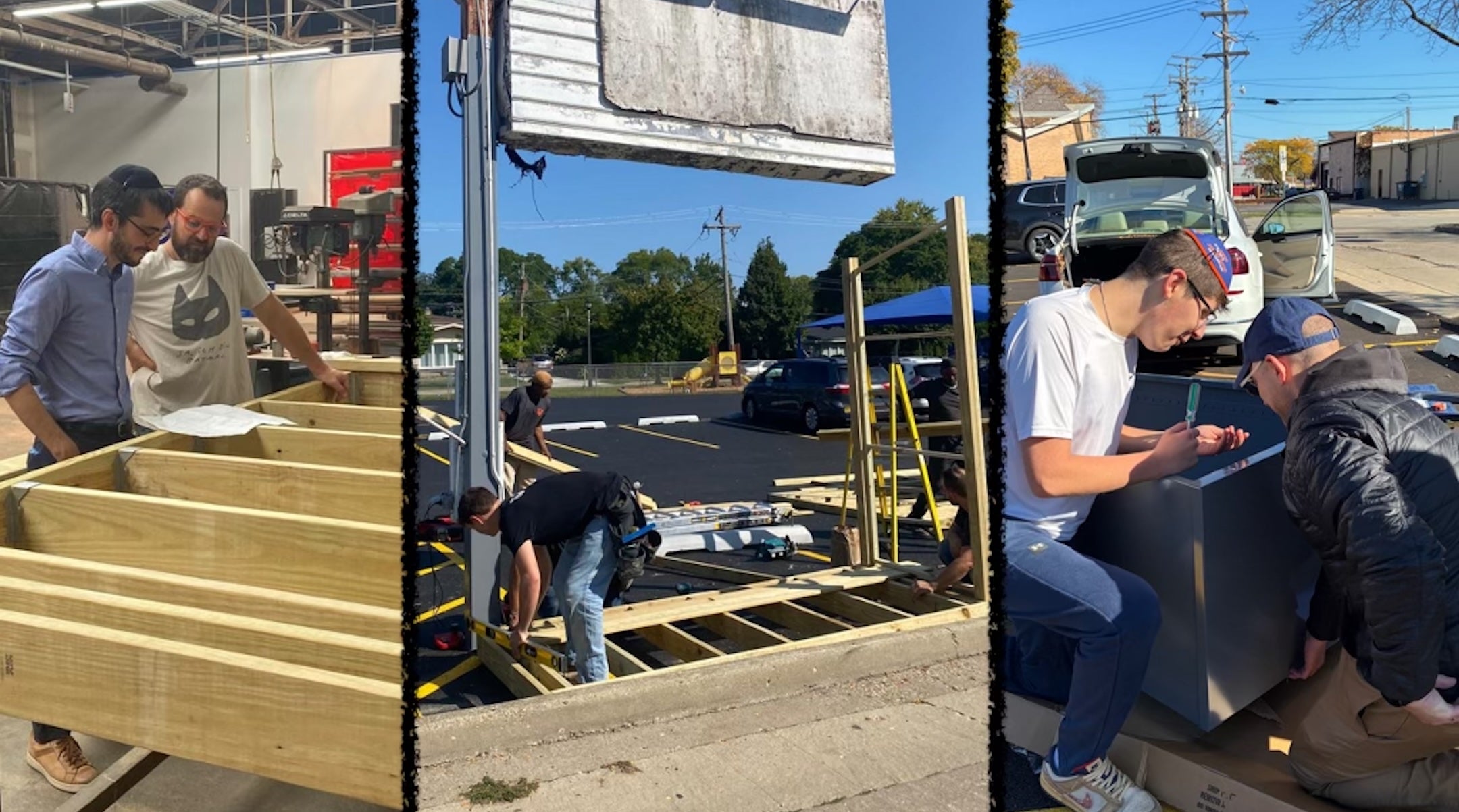 Volunteers construct Hersh’s Fridge, a kosher community fridge in the suburbs of Chicago. (Courtesy Hody Nemes)