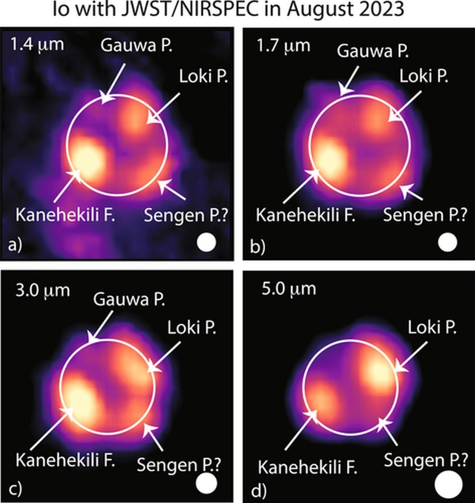 *This figure shows some of the JWST’s images of Io. Each one is at a different wavelength, shown in the top left of each panel. “The image at 1.7 μm is taken at the center of the SO band (1.705–1.709 μm), and hence contains both thermal volcanic and SO emissions,” the authors write. “The latter is minute compared to the thermal emissions.” Image Credit: de Pater et al. 2025. JGR Planets*