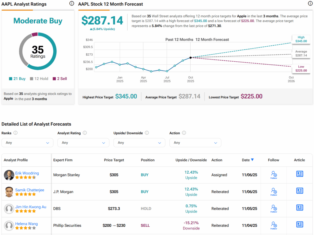 Turning to Wall Street, analysts have a Moderate Buy consensus rating on AAPL stock based on 21 Buys, 12 Holds, and two Sells assigned in the past three months, as indicated by the graphic below. Furthermore, the average AAPL price target of $287.14 per share implies 5.8% upside potential.