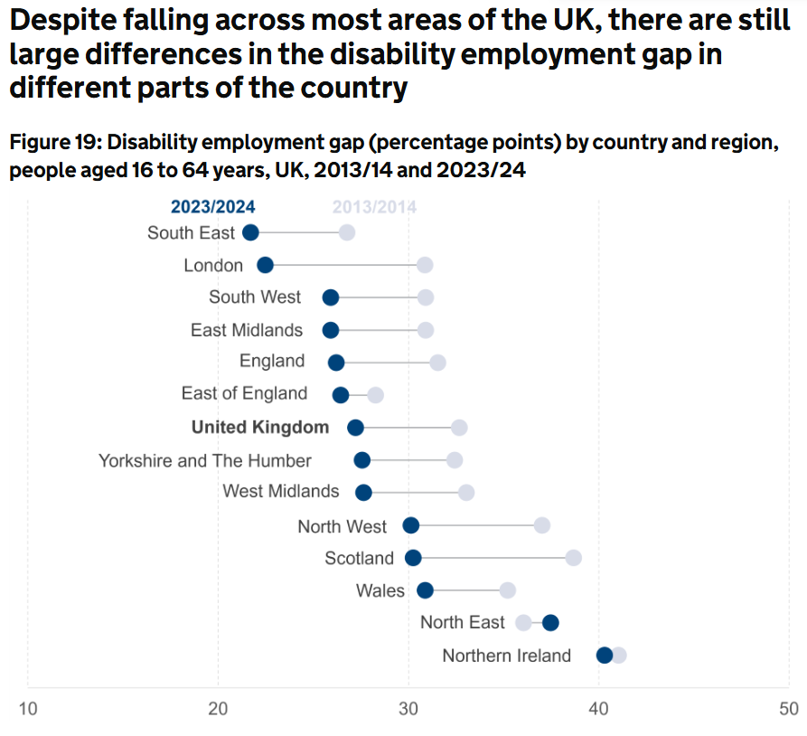 “All areas of the UK have seen a reduction in the disability employment gap between 2013/14 and 2023/24 except for the North East where the gap has increased by 1.4 percentage point, although this increase was not statistically significant.”