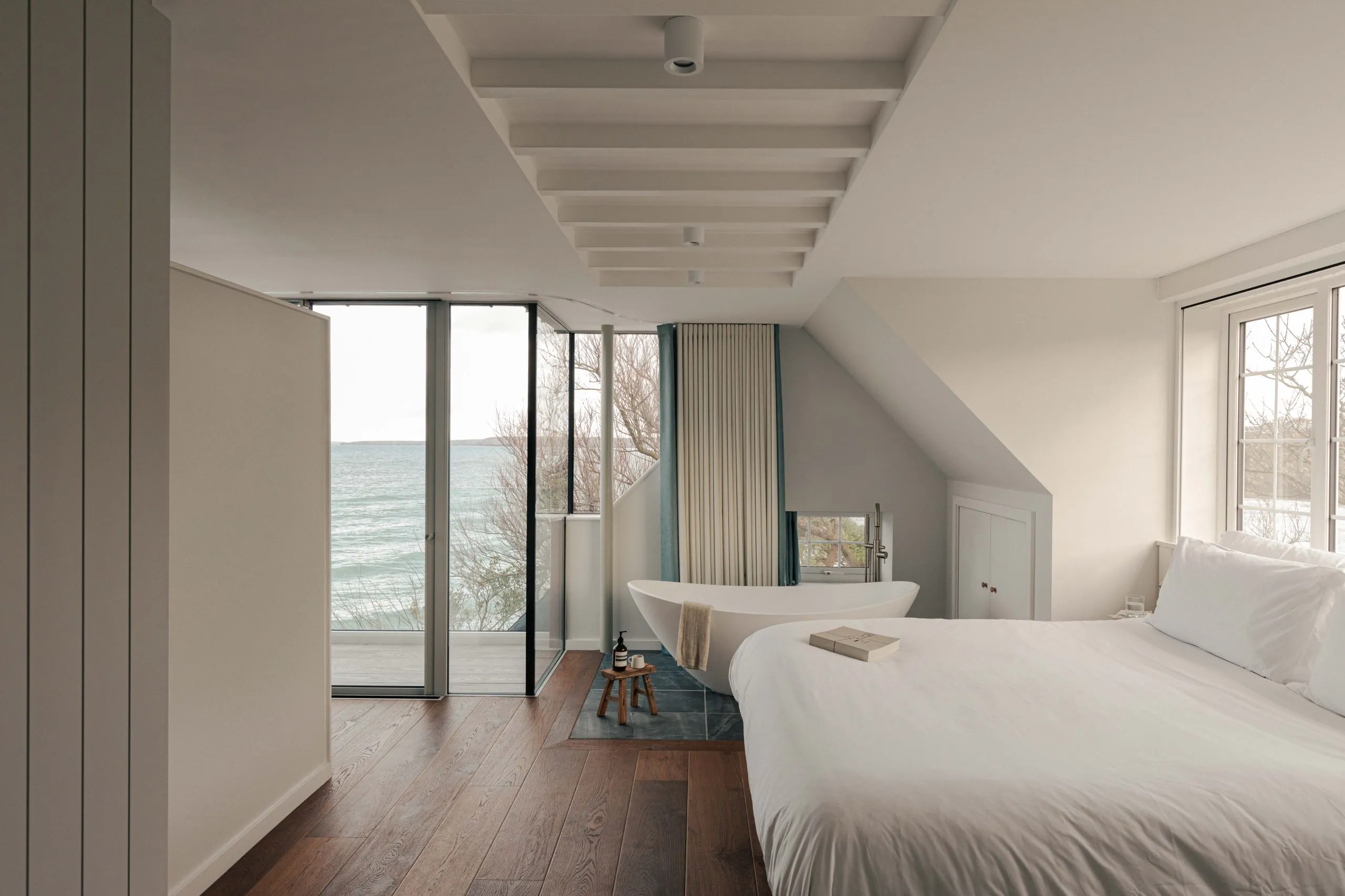We extended into the existing roof space, without altering its height or form. Internally, the ceilings were lowered in parts to accommodate new floor areas within the vaulted spaces. New bedrooms were carved out of projecting gable ends with floor-to-ceiling glass that frames panoramic views of the neighbouring harbour.