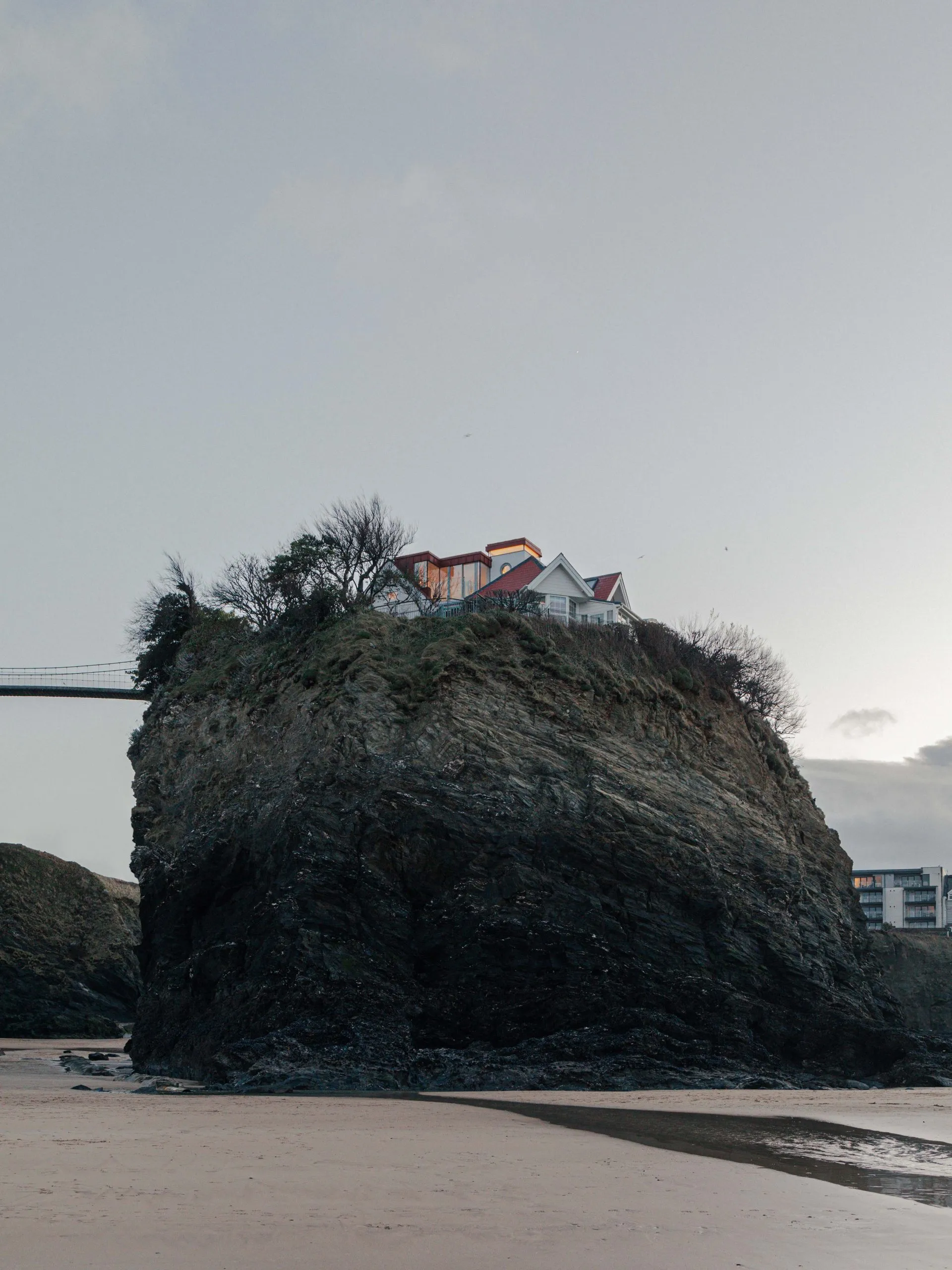 The distinctive 260m2 house is cut off when the tide is high, only accessible via a private suspension bridge. It features a striking red roof and rough-cast rendered elevations, and over the years, has been painted by many artists as well as being written about.