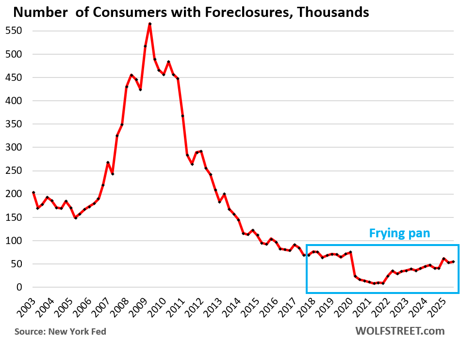Foreclosures are very low. The number of consumers with foreclosures in Q3 rose to 54,760, well below the low end of the 65,000-to-90,000 range of the Good Times in 2018-2019, and far below the number of foreclosures in prior years.