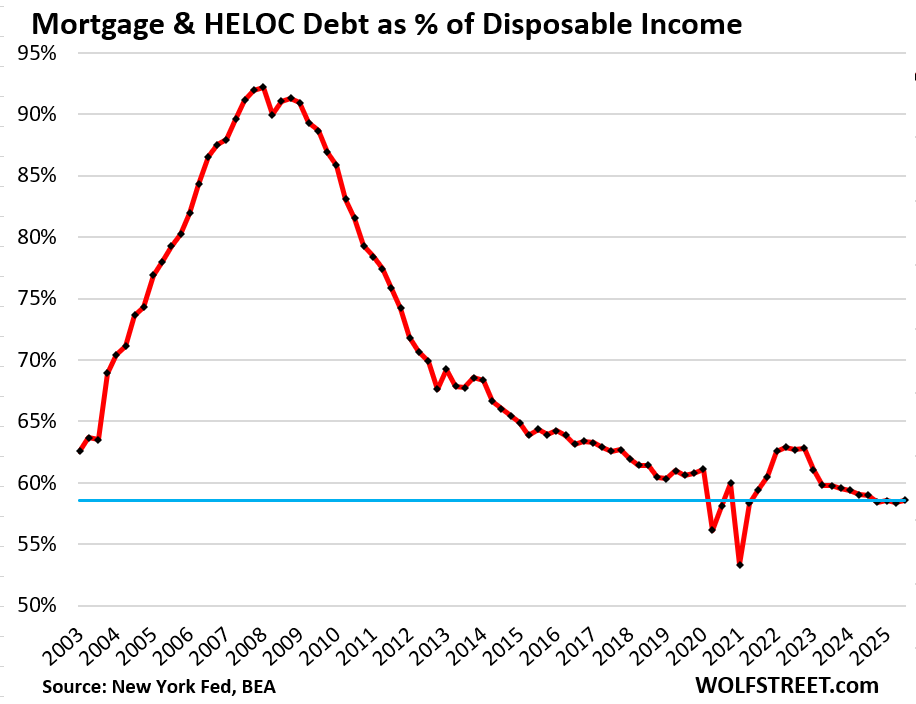The housing-debt-to-disposable income ratio in Q3 inched up to 58.6%, just a hair higher than in Q2, which had been the lowest on record, except the four quarters during the pandemic when stimulus funds distorted household incomes into absurdity.