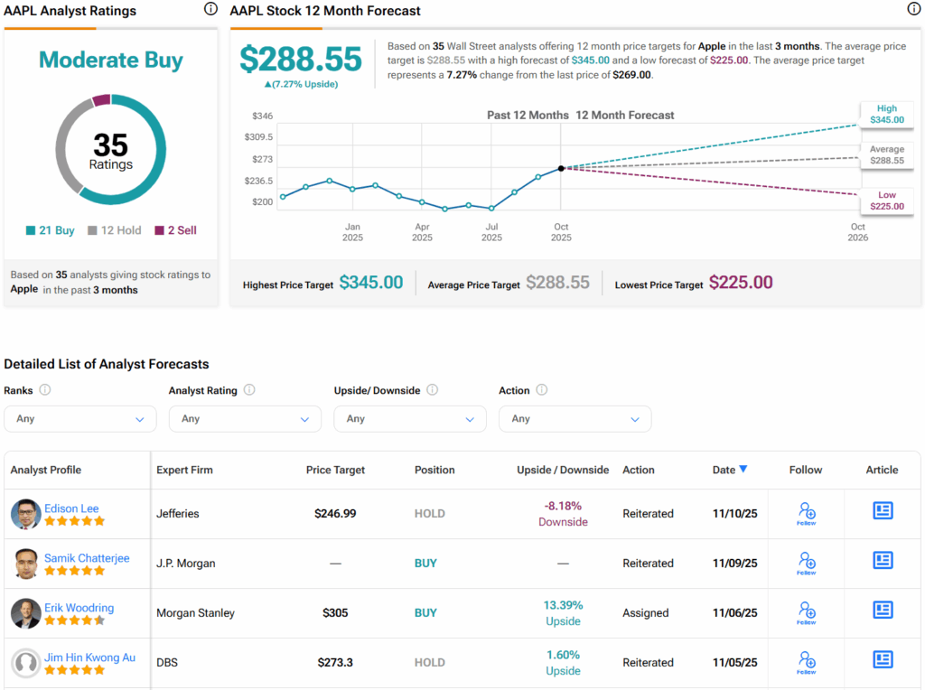 Turning to Wall Street, analysts have a Moderate Buy consensus rating on AAPL stock based on 21 Buys, 12 Holds, and two Sells assigned in the past three months, as indicated by the graphic below. Furthermore, the average AAPL price target of $288.55 per share implies 7.3% upside potential.