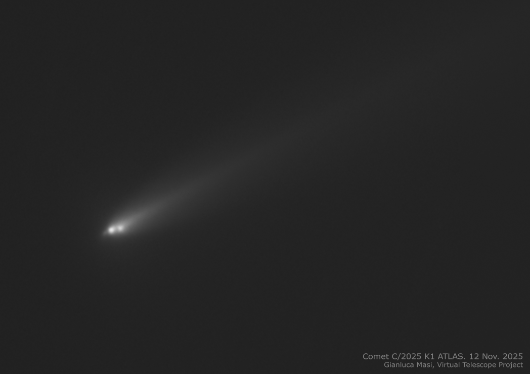 We had just the time to capture that handful of frames before clouds covered the whole sky. We had less than 10 minutes of clear sky to capture new images of comet C/2025 K1 ATLAS, clearly detecting three fragments of the original nucleus and possibly a fourth one.”