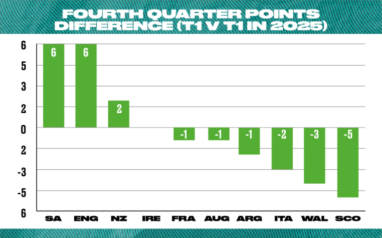 While the margins are slim, the try-scoring stats support this argument. The Boks have averaged more tries in the fourth quarter (1.7) than any other Tier One team, while England – along with the All Blacks – have conceded the fewest on average (0.8).