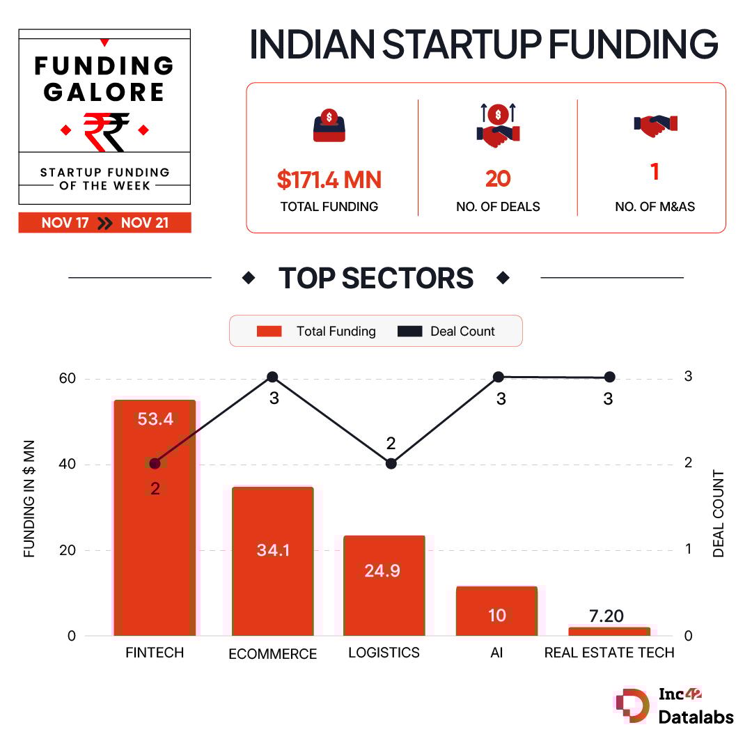 Between November 17 and November 21, twenty startups cumulatively raised $171.4 Mn, marking an over 5% uptick from the $162.9 Mn bagged by 22 startups in the previous week