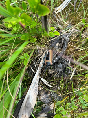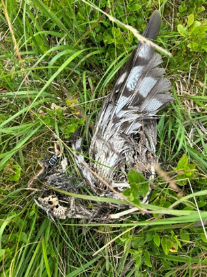 When NE staff noticed that 254843’s satellite tag had stopped transmitting, they followed established procedures to locate her. The bird’s remains were found roughly 1.2 kilometres from her nest close to where she had been learning to hunt under her parents’ watchful eyes. At first, the team suspected natural predation.