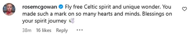 Patricia Arquette commented: ‘Rest in peace interstellar diamond!’ while Rose McGowan wrote: ‘Fly free Celtic spirit and unique wonder. You made such a mark on so many hearts and minds. Blessings on your spirit journey.’