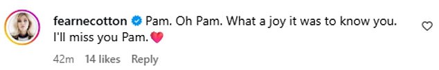 TV presenter Fearne Cotton wrote: ‘Pam. Oh Pam. What a joy it was to know you. I’ll miss you Pam.’