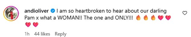 Chef Andi Oliver – mother of TV presenter Miquita Oliver – wrote: ‘I am so heartbroken to hear about our darling Pam… what a WOMAN!! The one and ONLY!!!’