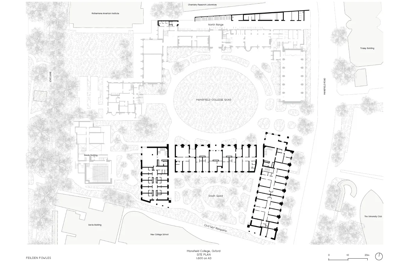 The accommodation is part of the college’s Estate Transformation Project, billed as the most ‘significant investment in Mansfield’s site for decades’. It includes new academic and social spaces, improved accessibility to the site’s historic buildings, a ‘pocket park’, improved landscaping, a new Porters’ Lodge gatehouse,  and ‘better permeability throughout the site’.