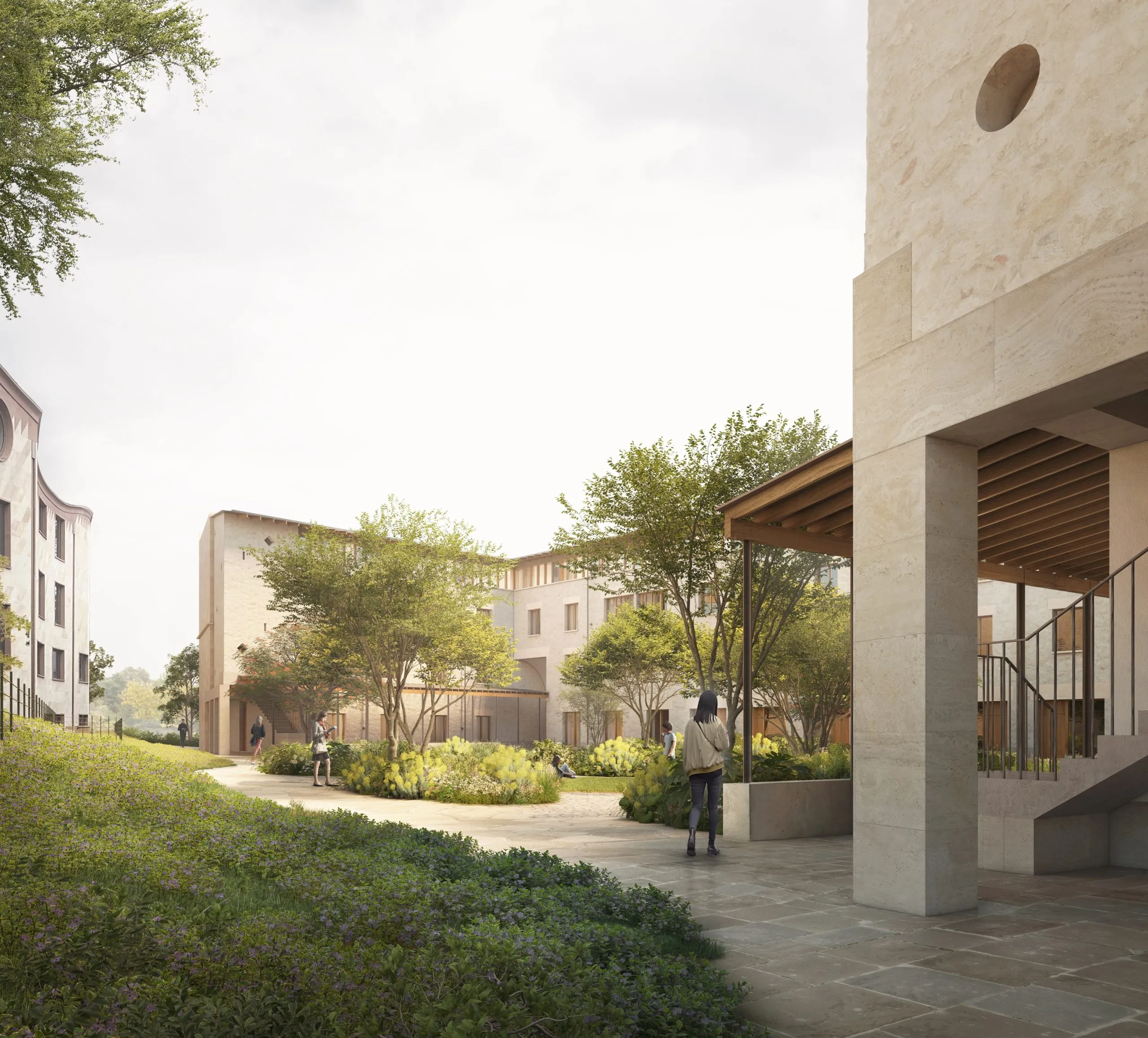 Within the south quad, the building’s character becomes softer and more domestic in scale. Covered walkways blur the distinction between inside and outside, deep eaves shelter circulation routes, and a generous, natural planting scheme weaves between the buildings.