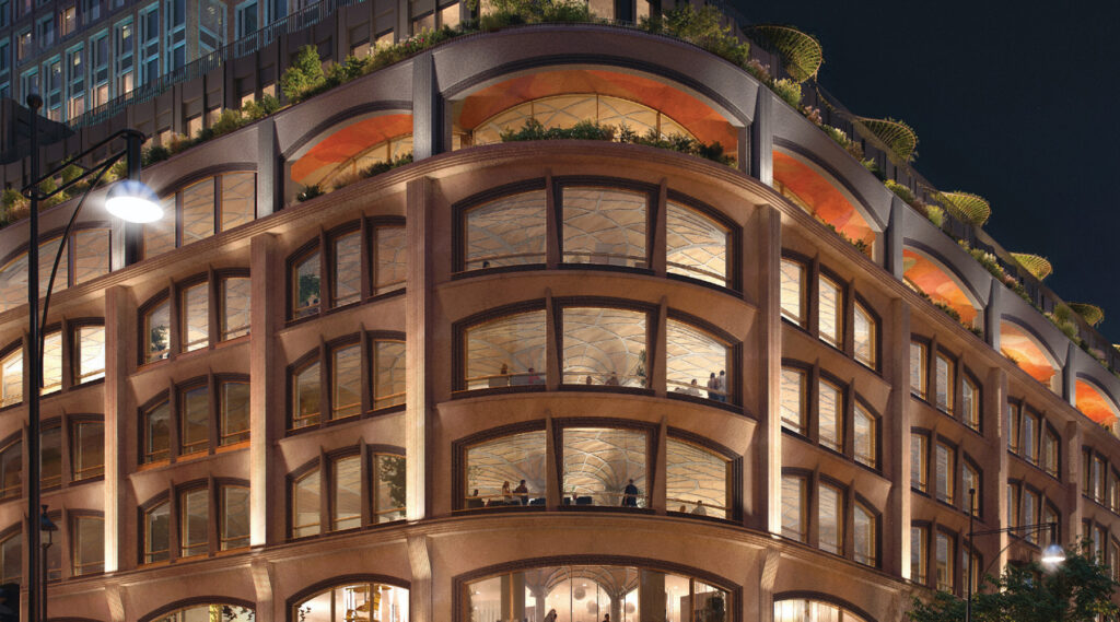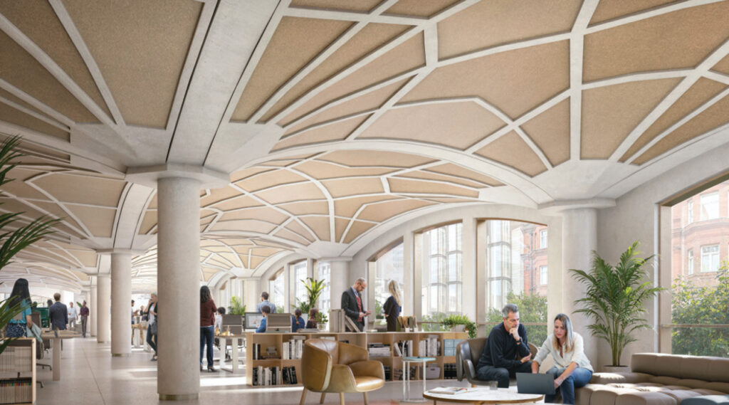 The medieval inspiration comes in the design of the replacement office and retail floors, which will use a modern funicular floor structure — effectively a contemporary take on the fan-vaulted ceilings of Gothic cathedrals. The technology significantly reduces the amount of concrete needed, while early concept images show the vaulted undersides left exposed.
