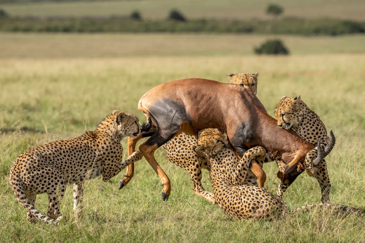 Unlike cheetahs hunting on their own, groups can tackle larger, faster prey by working together. Here, four brothers take down a topi antelope. Credit: Getty Images