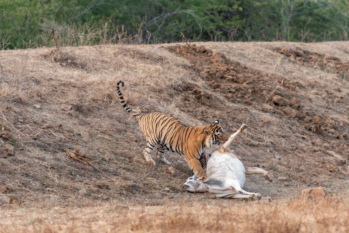 A wild male tiger kills a domestic cow in Ranthambore National Park, India. Credit: Getty Images