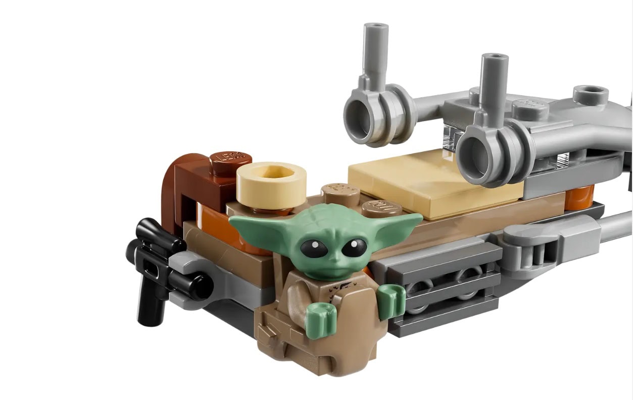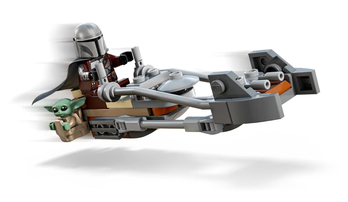 SPEEDER BIKE – Attach The Mandalorian’sblaster rifle to the back of the speeder bike, and place him in the driver’s seat with Grogu alongside in the attached satchel