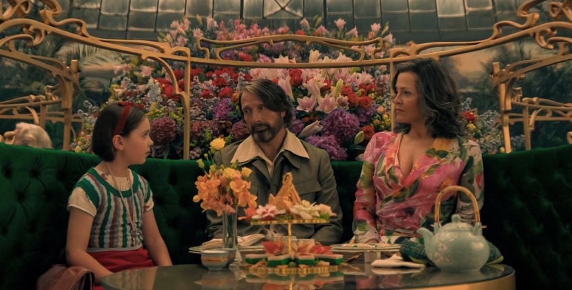 One night, Aurora notices a stranger (credited as Intriguing Neighbor and played by regular Bryan Fuller collaborator, the endlessly engaging no matter the role, Mads Mikkelsen, here in what is tonally a riff on Leon the Professional by way of Guillermo del Toro) sneaking around and trying to remain undetected, seemingly focused on something with great purpose. It turns out the man is an assassin of monsters, taking down a multi-eyed dragon in Chinatown during what appears to be a highly festive celebration of the Chinese New Year. Naturally, Aurora gets the idea to send over an envelope of money, hiring him to kill the monster under her bed. The neighbor (who is amusingly always being corrected for pronouncing Aurora as “Erora”) insists that he doesn’t kill monsters. Meanwhile, Aurora assures him she knows what she saw.