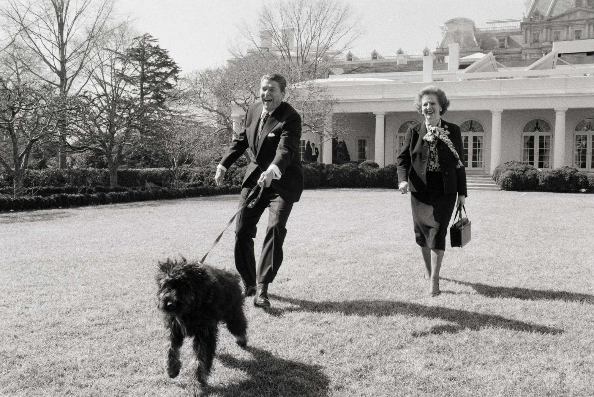 Ronald Reagan and Margaret Thatcher walk Reagan’s dog Lucky on the White House lawn, 1985 Getty Images