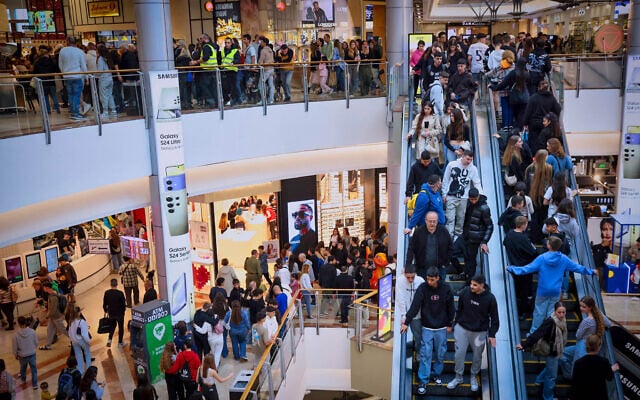 Illustrative: People shopping at the Azrieli mall in Tel Aviv, during the Municipal Elections, February 27, 2024. (Flash90)