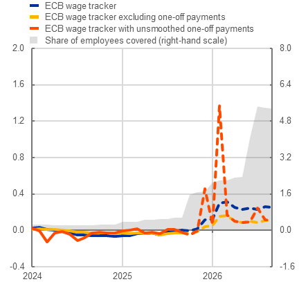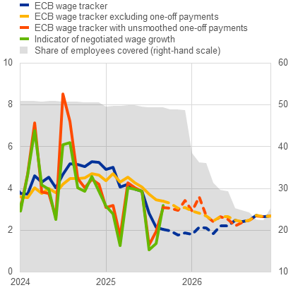 The European Central Bank (ECB) wage tracker, which covers active collective bargaining agreements, indicates negotiated wage growth with smoothed one-off payments of 3.2% in 2025 (based on a coverage of 49.5% of employees in participating countries) and 2.3% in 2026 (based on a coverage of 28.8%). The ECB wage tracker with unsmoothed one-off payments indicates negotiated wage growth of 3.0% in 2025 and 2.7% in 2026. The wage tracker excluding one-off payments indicates an easing of negotiated wage growth from 3.9% in 2025 to 2.6% in 2026. The headline ECB wage tracker is better suited to describing quarterly or monthly dynamics in negotiated wages as it smoothens one-off payments over time. Meanwhile, the ECB wage tracker with unsmoothed one-off payments is better suited to describing yearly dynamics, ensuring that one-off payments are not smoothed twice when constructing the yearly outcomes.