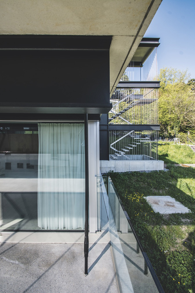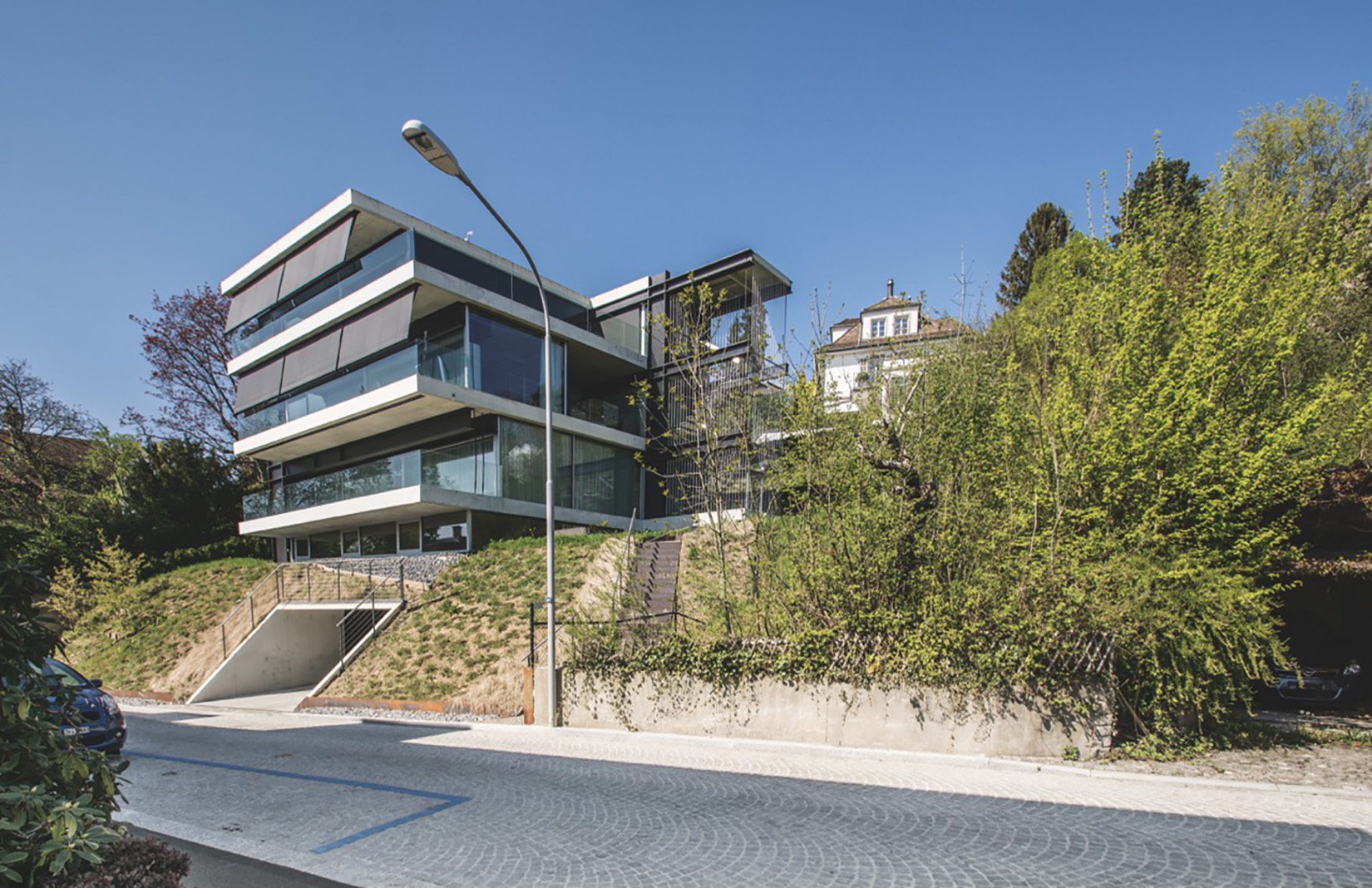 At the centre of this building’s identity is a structural omission: one load-bearing column was intentionally removed from architect Christian Kerez’s daring design. Built above Krönleinstrasse in Zurich’s 7th district — Kreis 7 — the House with a Missing Column reveals its thinking through structure. Black steel stelae brace three sides of the building, while long cantilevered beams carry the load without visible support on the fourth. The effect is disarming — an essay in architecture where forces are felt rather than seen.