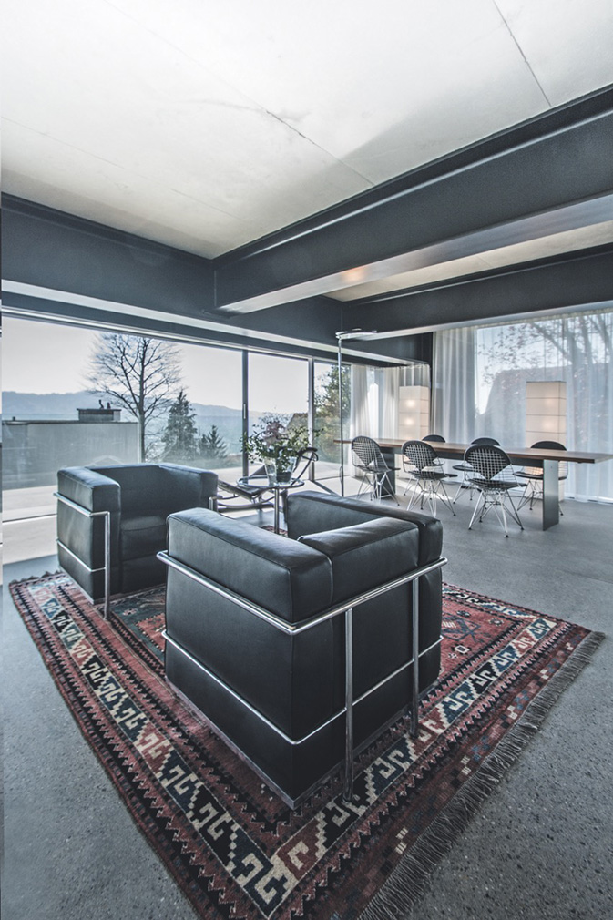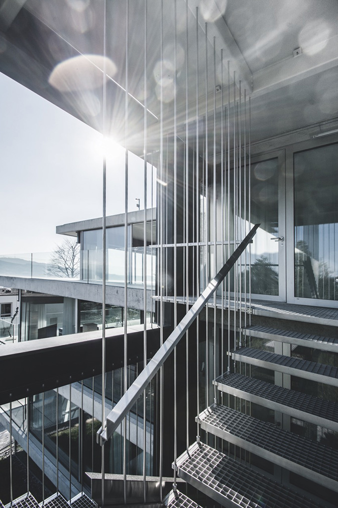 The steel frame, thermally separated from the glass façade, penetrates the concrete slabs and releases the interiors from conventional constraints. Inside, frameless sliding glass walls dissolve the boundary between apartment and landscape, opening views across the city, lake and surrounding tree canopy. Balconies and loggias extend the living spaces outward, while deep floor plates and overhangs temper light and heat with quiet control.