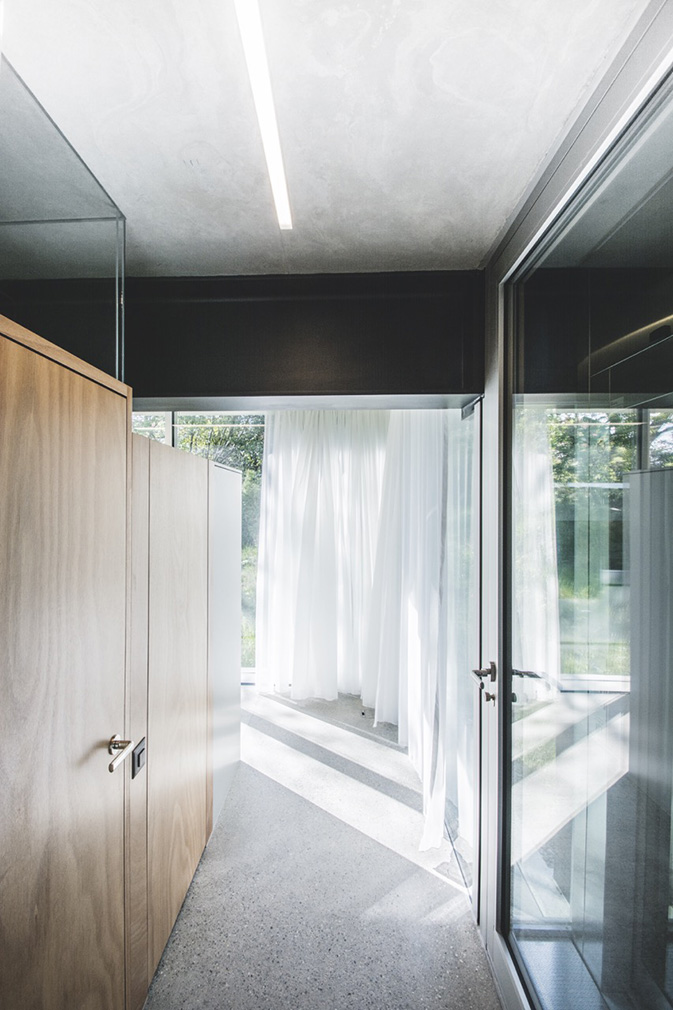 Within the plan a central, lightweight core clad in wood veneer organises the living, sleeping and service zones. Terrazzo floors, built-in elements and restrained materials reinforce a mood that is controlled and deliberate. Below, a recessed concrete base contains studios and a garage — they’re reached via a tunnel-like driveway that further dramatises the approach. Seen together, the elements translate an abstract structural idea into a lived condition, where lightness, exposure and gravity are felt daily.