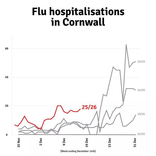 The number of flu cases in Cornwall continued to rise last week. An average of 17 beds every day at Royal Cornwall Hospitals NHS Trust were occupied by flu patients in the week ending 14th December.