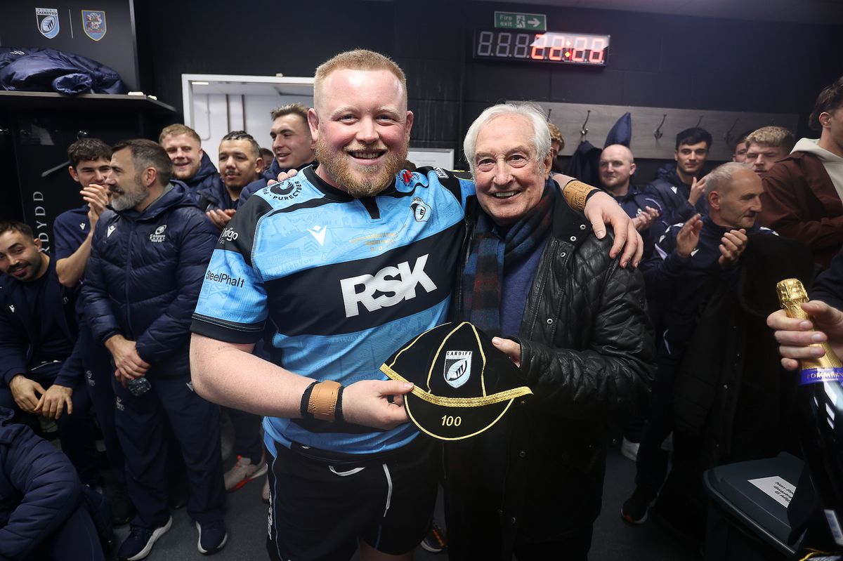 Cardiff prop Keiron Assiratti (left) receiving his 100th club cap from Wales legend Sir Gareth Edwards(Image: Chris Fairweather/Huw Evans Agency)