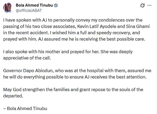 ‘I spoke with AJ on the phone to personally convey my condolences over the death of his two associates,’ President Tinubu said in a statement.