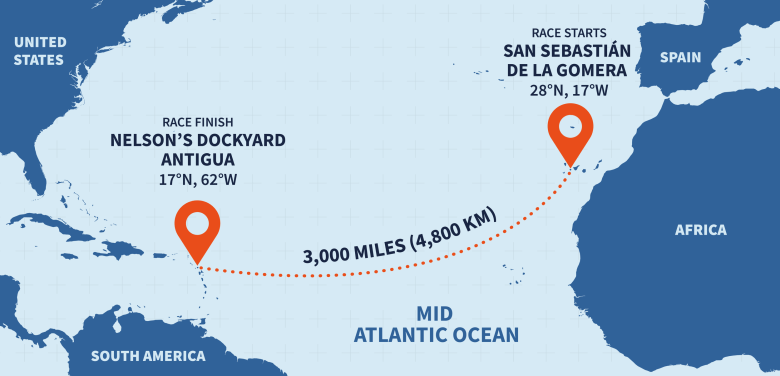 Pictured: The 3,000 mile race starts in the Canary Islands and finishes in Antigua.