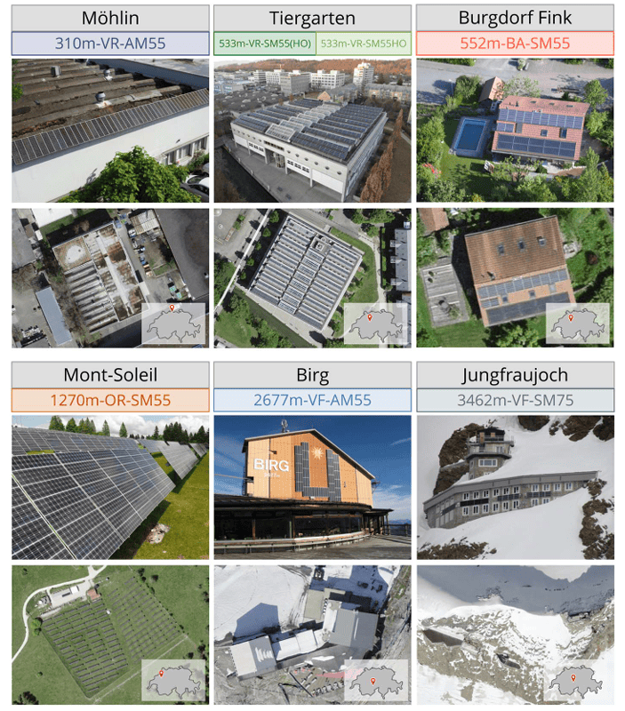 Images of the different sites with solar panels installed System photos, showing the profile view (top) and aerial view (bottom). Approximate location in Switzerland is indicated in the bottom right corner. The Tiergarten system is separated in the East and West parts of the rooftop in the data and results. Credit: EES Solar, 2025.