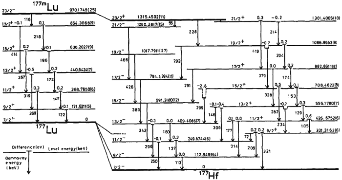 The differences in electron energy levels occur in all atoms, from the simplistic hydrogen to the most complex elements of all. This graph illustrates the energy level differences in an atom of Lutetium-177. Note how there are only specific, discrete energy levels that are acceptable. While the energy levels are discrete, the positions of the electrons are not.