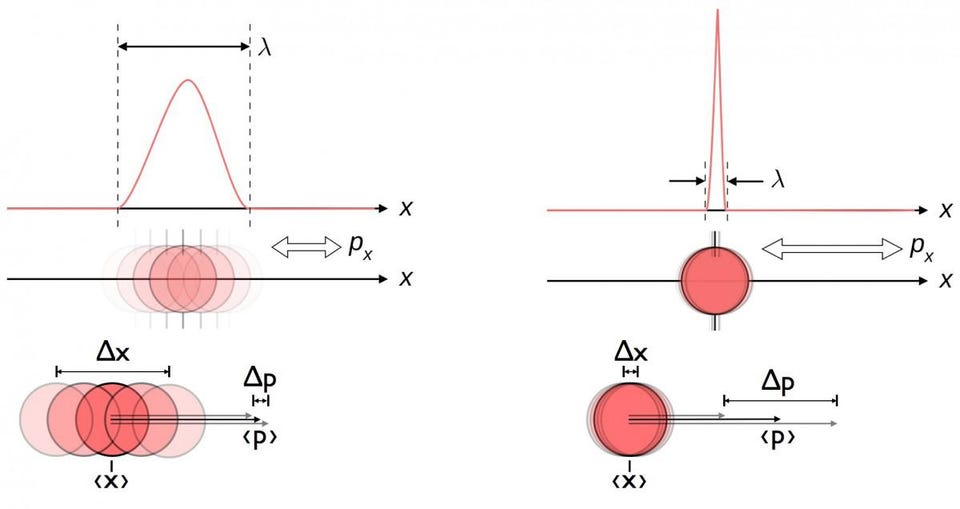 This diagram illustrates the inherent uncertainty relation between position and momentum. When one is known more accurately, the other is inherently less able to be known accurately. Both position and momentum are better described by a probabilistic wavefunction than by a single value. Other pairs of conjugate variables, including energy and time, spin in two perpendicular directions, or angular position and angular momentum, also exhibit this same uncertainty relation.