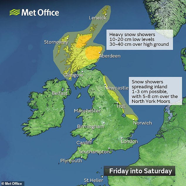 ‘Snow and ice warnings remain in force for many areas, with the risk of heavy snow showers, especially across northern Scotland and over higher ground elsewhere, though many inland areas will stay largely sunny and clear.
