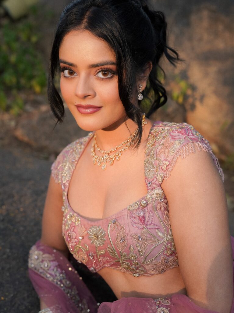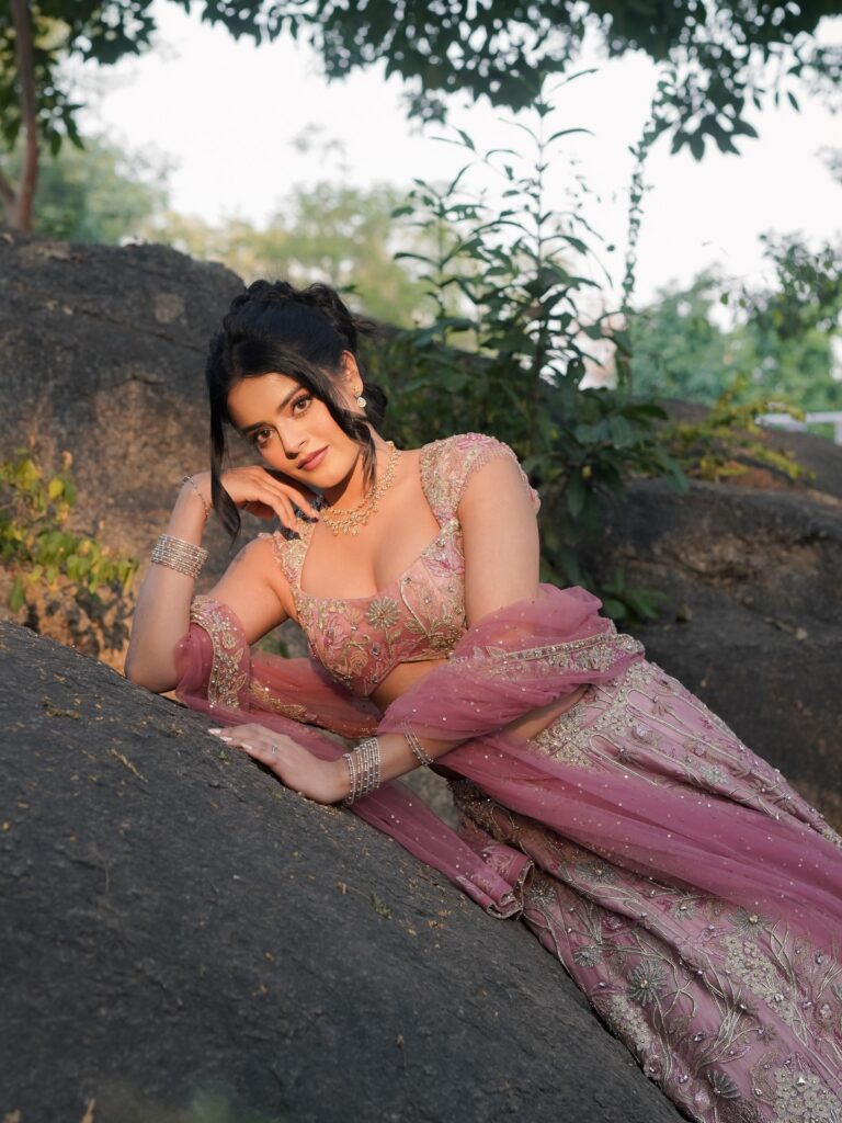 Her latest photoshoot keeps things soft and quietly striking. She’s seen in a blush pink lehenga with detailed embroidery, styled without going overboard. The space around her is warm and simple, plush seating, muted tones, nothing flashy fighting for attention. Her expressions stay easy and natural, almost like she forgot the camera was there. That’s what works. It