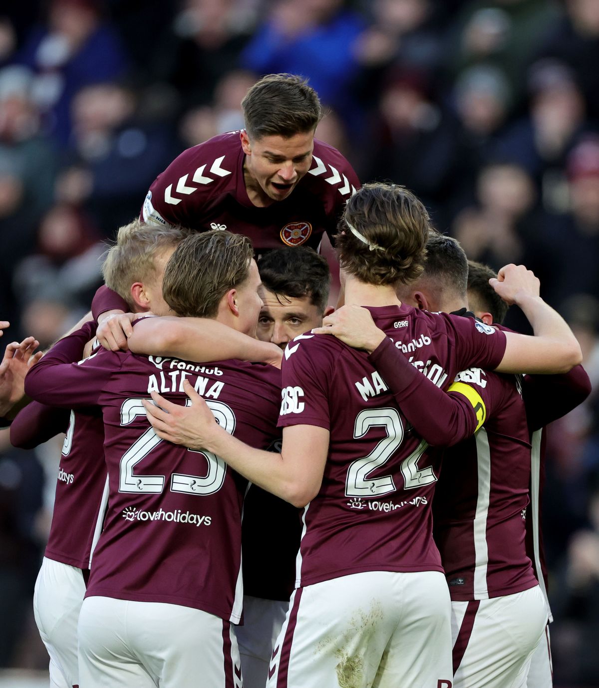 Heart of Midlothian’s Craig Halkett (centre) is mobbed by his team mates after scoring his side’s winner