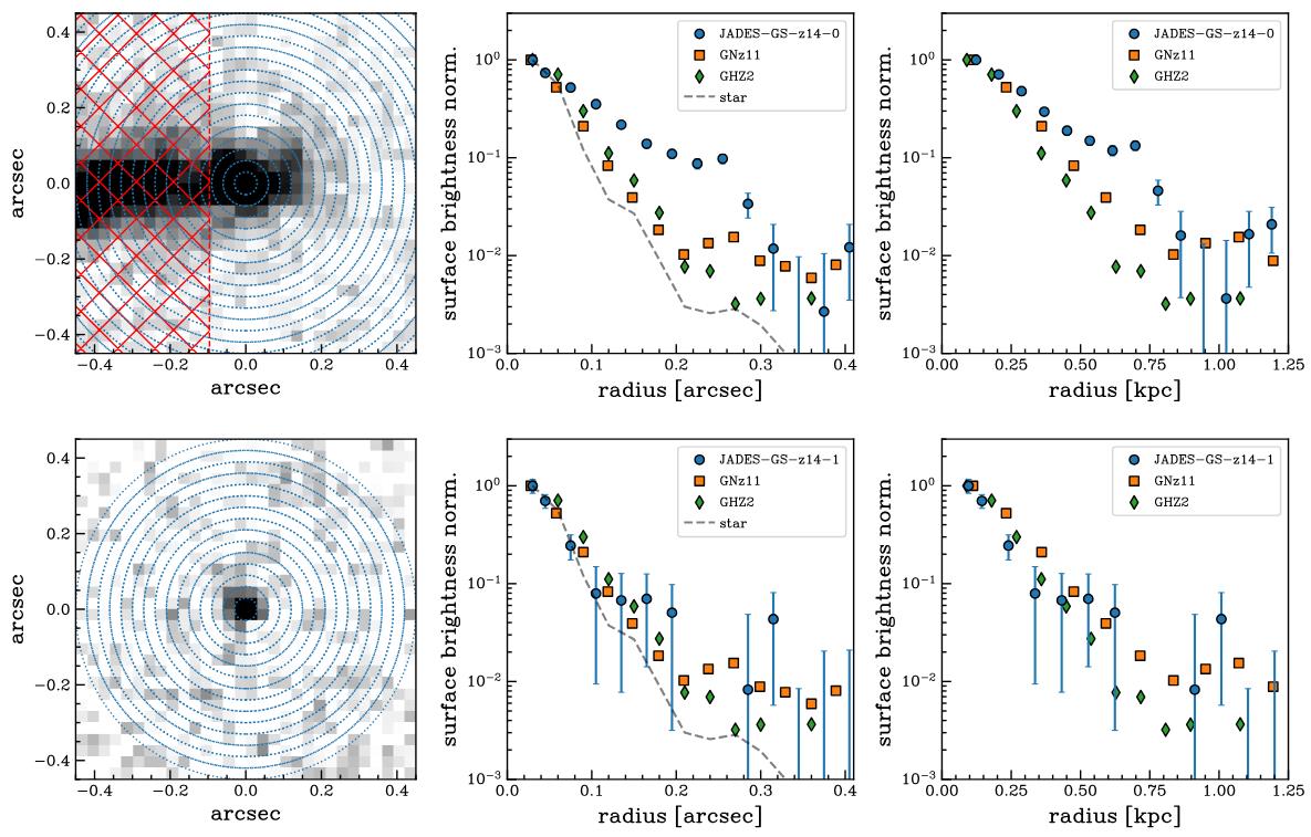 Among the most distant galaxies, GN-z11 and GHZ2 are among the brightest, and yet are still remarkably compact. JADES-GS-z14-1 is more typical: fainter but still very compact, while JADES-GS-z14-0 is more puzzling: bright and extended, suggesting a physical size of ~1700 light-years at its incredible distance.