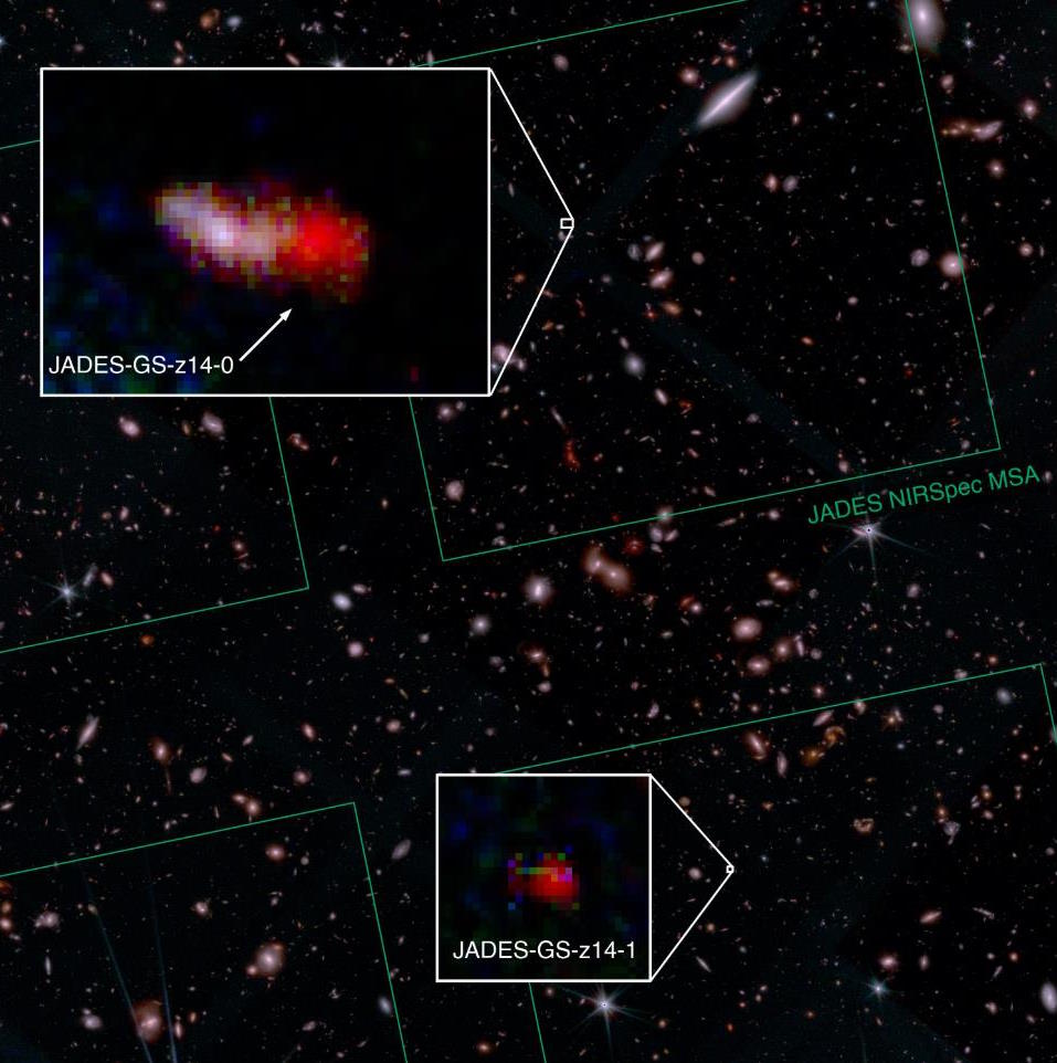 JADES-GS-z14-0, in the top inset box, is found behind (and just to the right of) a closer, brighter, bluer galaxy. It was only through the power of JWST spectroscopy with incredible resolution, capable of separating the two sources, that the nature of this record-breakingly distant object could be determined. Its light comes to us from when the Universe was only 285-290 million years old: just 2.1% of its current age. JADES-GS-z14-1, just below it, comes from when the Universe was ~300 million years old. Compared to large, modern-day galaxies, all early galaxies contain a paucity of stars and have irregular, ill-defined shapes.