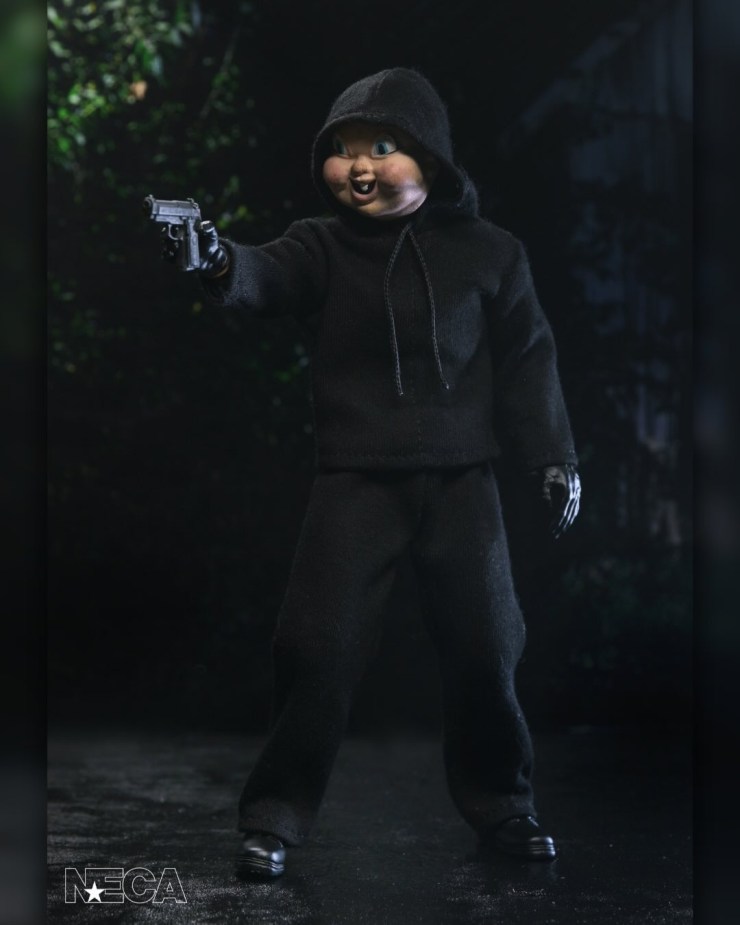 “There’s nothing cute or innocent about this ruthless killer. Dressed in tailored fabric clothing inspired by vintage toy lines, this fully articulated, 8-inch scale figure includes interchangeable masks, heads, hands, kitchen knives, baseball bat, sledgehammer, birthday cupcakes, and pistol. Comes in collector-friendly window box packaging.”
